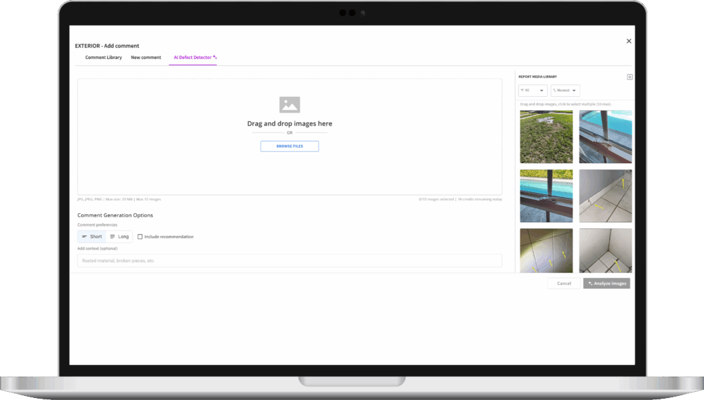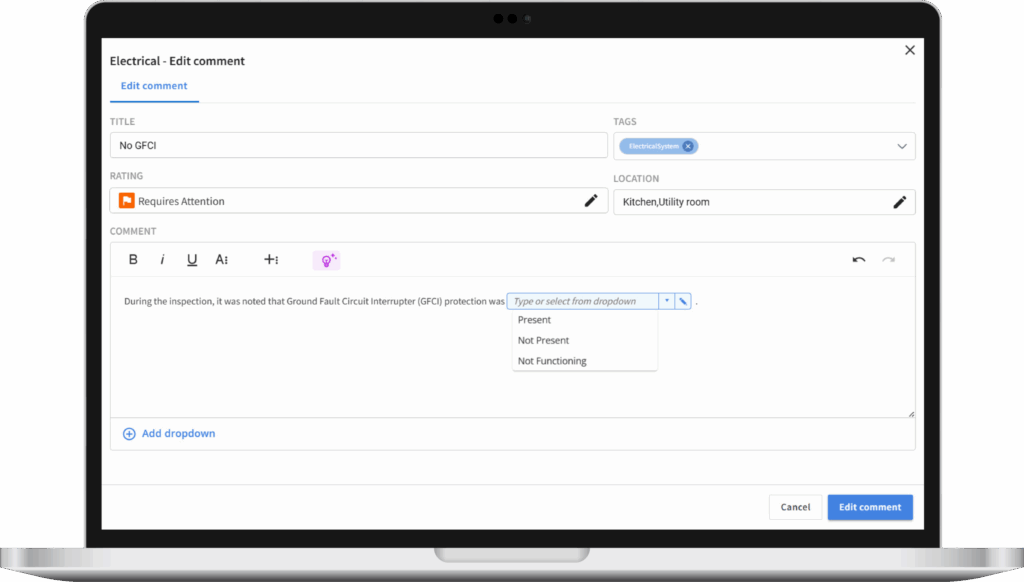 Flags potential defects in the home or systems shown in your inspection photos, then recommends comment categories to speed reporting.